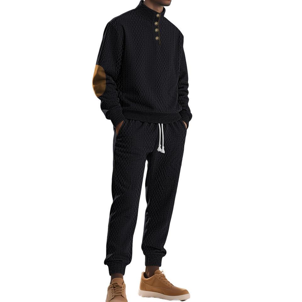 เสื้อสเวตเตอร์คอสูงลายแจ็คการ์ดสำหรับผู้ชายและกางเกงขายาว ชุดถักจากโพลีเอสเตอร์ สีพื้น สปอร์ต แคชชวล แขนยาว รุ่น DF-418