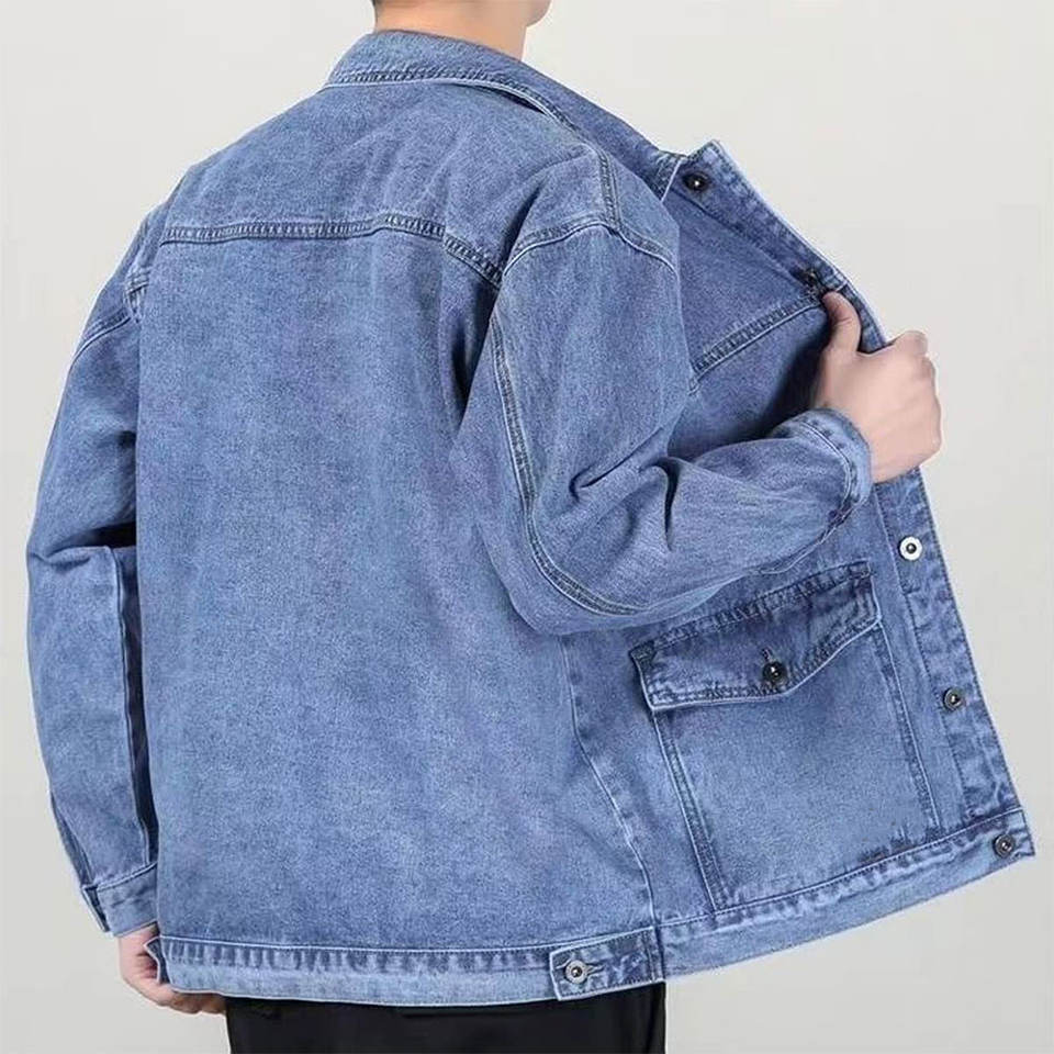 แจ็คเก็ตยีนส์ผู้ชายคุณภาพสูง 100% ผ้าฝ้าย ทรงสลิม ใส่สบาย สีพื้น สไตล์สตรีทแวร์ พร้อมซิปด้านหน้าและโลโก้