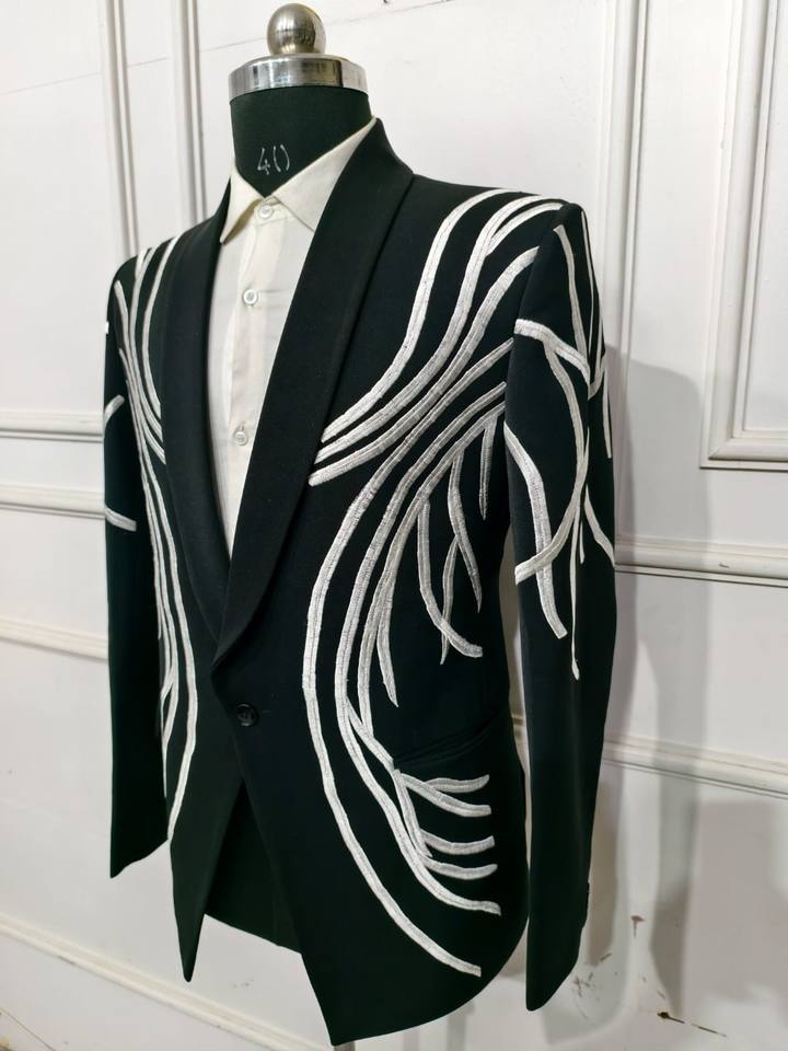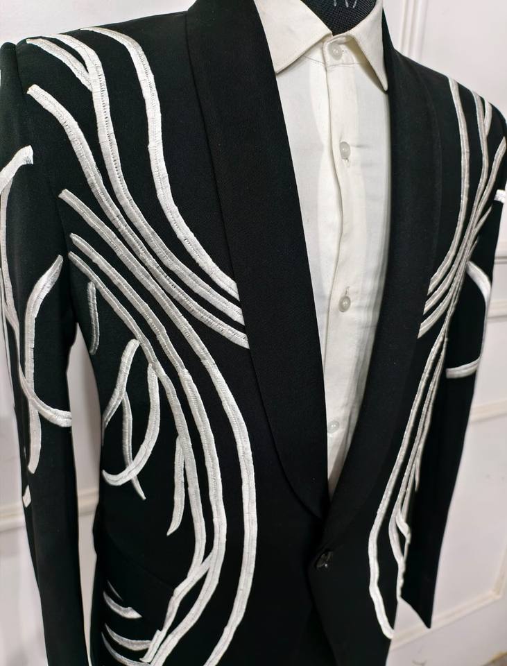สูทสีดำปักลายสำหรับผู้ชายชุดทักซิโดกระดุมแถวเดียวทรงสลิมฟิต2ชิ้นขนาดใหญ่พิเศษ