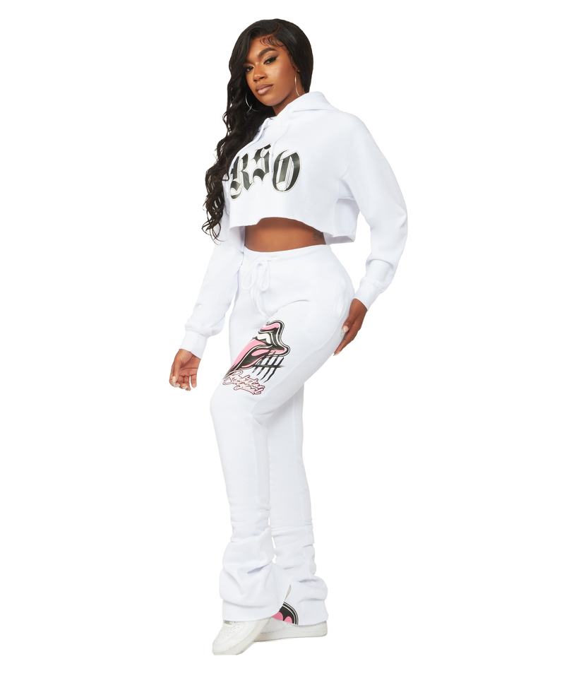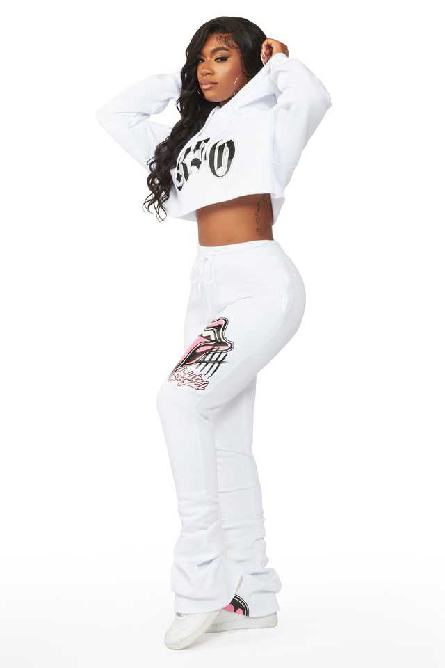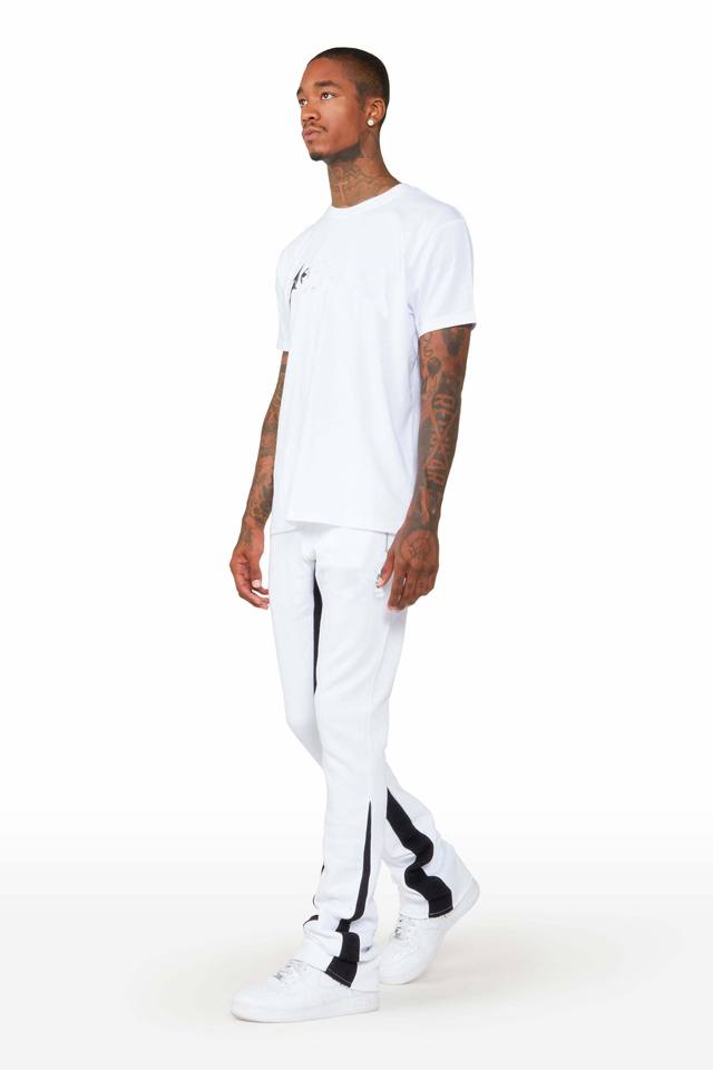 กางเกงสเวตเตอร์เอวยางยืดผ้าฝรั่งเศสสำหรับผู้ชายชุดสตรีทสีเปลวไฟสีขาวและกลางเอวสไตล์สแต็ก