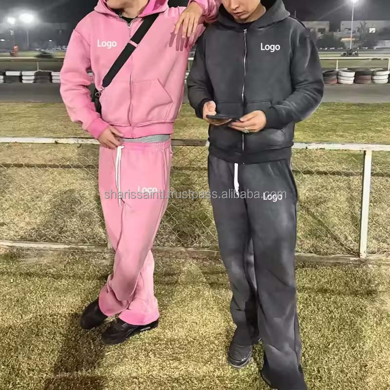 ชุดวอร์มคุณภาพสูงของผู้ชายชุดเสื้อวอร์มผ้าหนากันแดดซีดซีดจางมีฮู้ดและกางเกงบานทรงหลวม