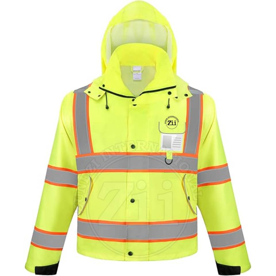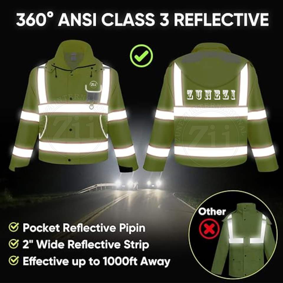เสื้อฮู้ดกันน้ำคุณภาพสูงสำหรับผู้ชาย แถบสะท้อนแสง ระบายอากาศได้ดี มองเห็นได้ชัดเจน ได้มาตรฐานความปลอดภัย ANSI Class 2 EN ISO 20471