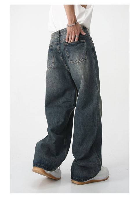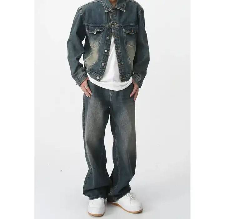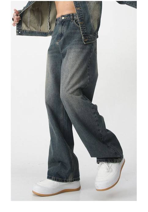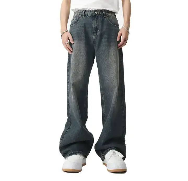 กางเกงยีนส์ขาตรงทรงหลวมสำหรับผู้ชายแนวสตรีทเอวยางยืดผ้าเดนิมผ้าฝ้ายระบายอากาศได้ดี