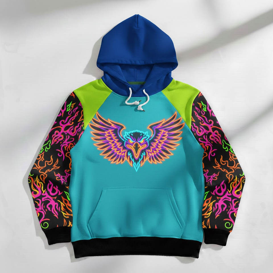 เสื้อฮู้ดดี้ผู้ชายลายกราฟิกดีไซน์ไฮเทคสีนีออน พร้อมลายวงจรดิจิทัลที่แขนเสื้อ ชุดกีฬาพิมพ์ลายแบบซับลิเมชั่น ผ้าฝ้าย 100% สำหรับฤดูหนาว