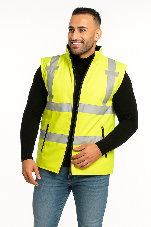เสื้อกั๊กนิรภัยสะท้อนแสงสำหรับผู้ชายชุดทำงานบุนวมสำหรับฤดูหนาวโลโก้ออกแบบได้ตามต้องการทำจากไมโครไฟเบอร์