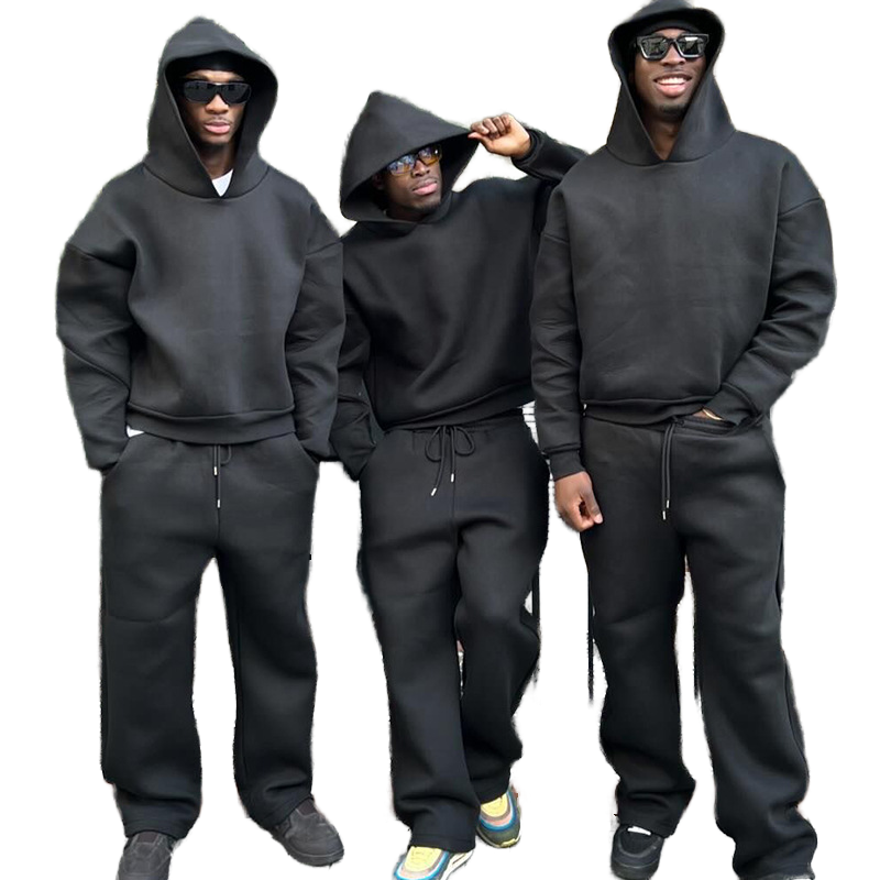ชุดวอร์มผู้ชายผ้าฟลีซหนานุ่ม ฮู้ดดี้โอเวอร์ไซส์ กางเกงจ็อกเกอร์ ขายส่ง เสื้อผ้าสตรีทแวร์แบบเรียบๆ สั่งทำได้ ชุด 2 ชิ้น ผ้าฝ้ายสำหรับฤดูหนาว ชุดเทค