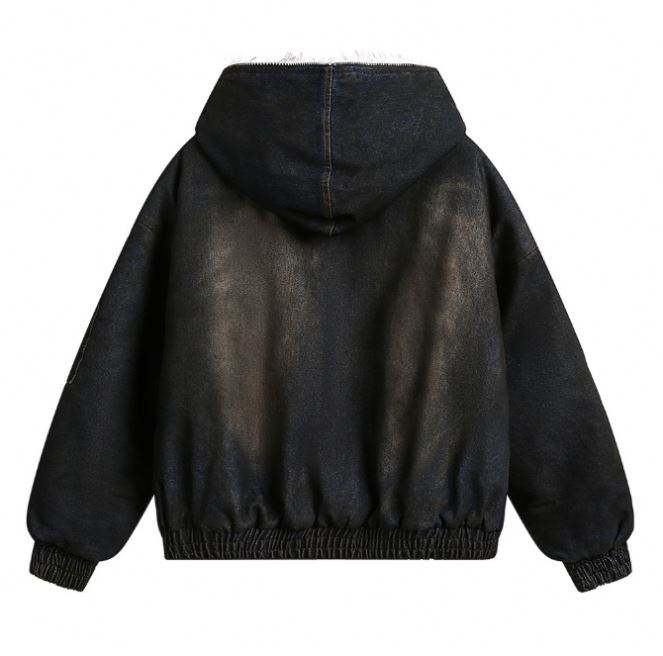เสื้อแจ็คเก็ตผ้าฝ้ายมีฮู้ดสำหรับผู้ชายฤดูหนาวสไตล์อเมริกันหลวมๆอินเทรนด์กระเป๋าเสื้อโค้ตผ้าฝ้ายเดนิมตกแต่ง