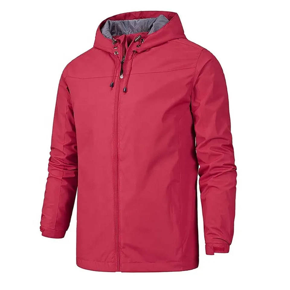 เสื้อแจ็คเก็ตกันลมมีฮู้ดสำหรับผู้ชาย ผ้าโพลีเอสเตอร์สั่งทำพิเศษ โลโก้ด้านหน้า กันน้ำ ระบายอากาศได้ดี สีพื้นเรียบง่าย สั่งทำสีและดีไซน์ได้