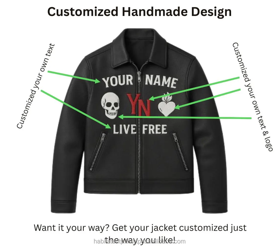 เสื้อแจ็คเก็ตผู้ชายหนังสีดำสำหรับนักขี่จักรยานถ่ายทอดสดฟรีลายหัวกะโหลกกราฟิกแนวสตรีทเสื้อบอมเบอร์ออกแบบได้ตามต้องการ