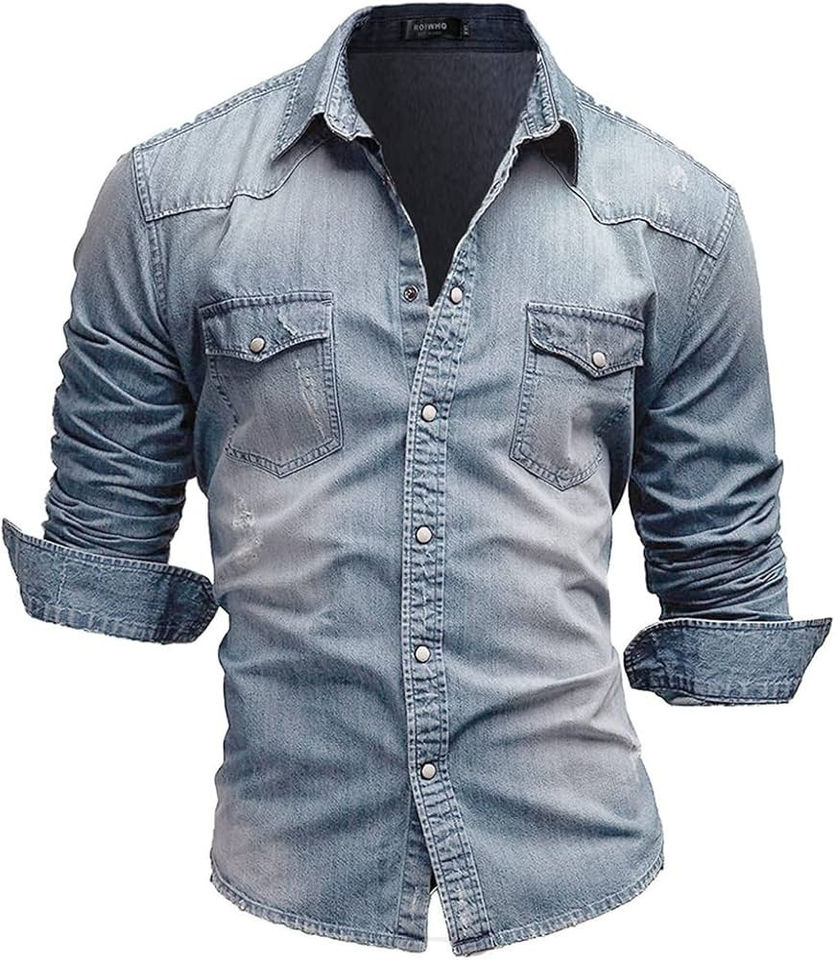 เสื้อเชิ้ตยีนส์ผู้ชาย ผ้าฝ้าย 100% คอตั้ง สไตล์ลำลอง วินเทจ ซักนิ่ม แขนยาว ระบายอากาศได้ดี ไซส์ใหญ่