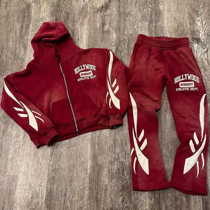 ชุดวอร์มใส่วิ่งสำหรับผู้ชายกางเกงวอร์มทรงหลวมมีฮู้ดกางเกงวอร์มขาบานชุดสูทแบบเรียงซ้อนกันของผู้ชายเครื่องแต่งกายแนวสตรีทแบรนด์ตามสั่ง