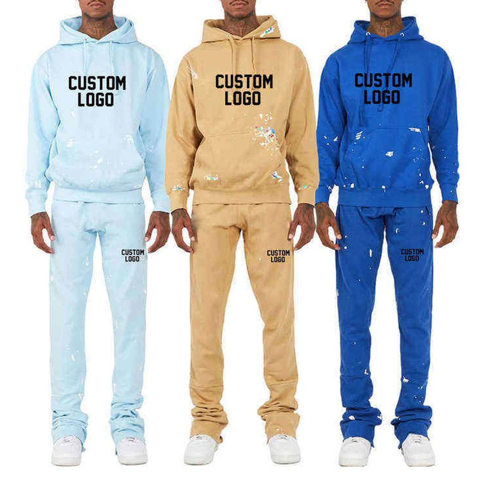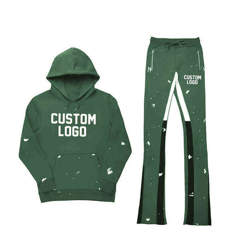 ชุดวอร์มผู้ชายแบบสั่งทำโลโก้ ชุดสองชิ้นผ้าหนา กางเกงขาบาน พิมพ์ลายพัฟฟ์ ชุดสเวตเตอร์โอเวอร์ไซส์ ชุดแทรคสูท สตรีทแวร์