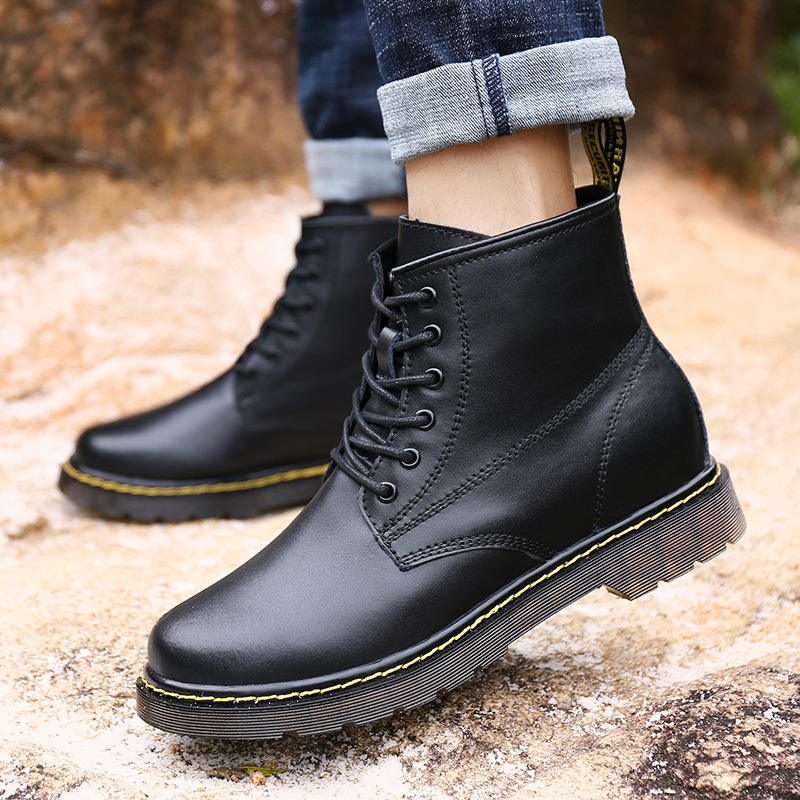 รองเท้าบูทหุ้มข้อหนังผู้ชายแบบผูกเชือก กันหิมะ อุ่นสำหรับฤดูหนาว กันลื่น ระบายอากาศ เพิ่มความสูงแบบซ่อน 8 ซม.