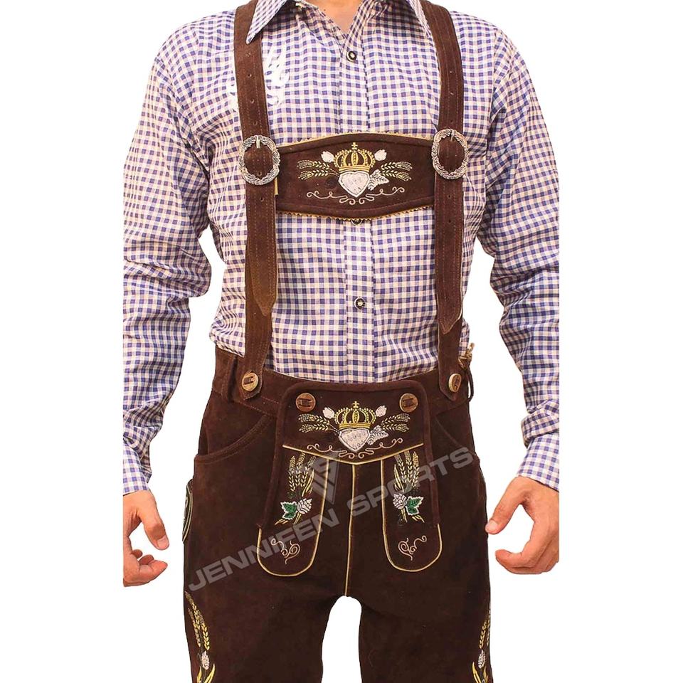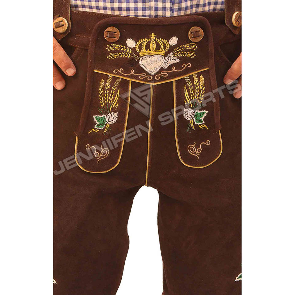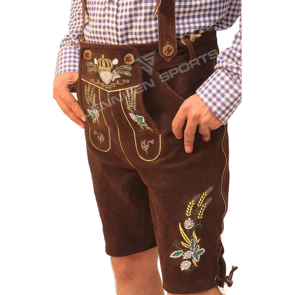 ผู้ชาย Lederhosen สั้นแขวน Cowhide หนังนิ่มปุ่มปิดด้านหน้าเย็บปักถักร้อยด้านข้างและกระเป๋าด้านหลังเข็มขัด Loops