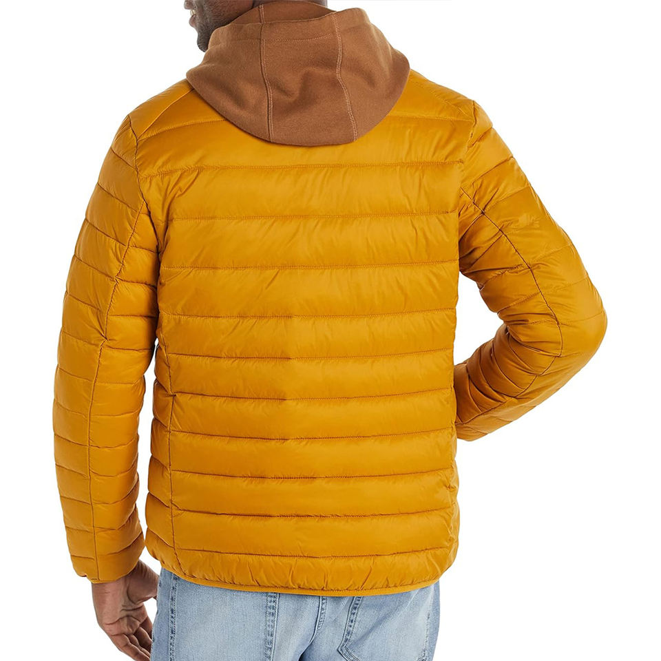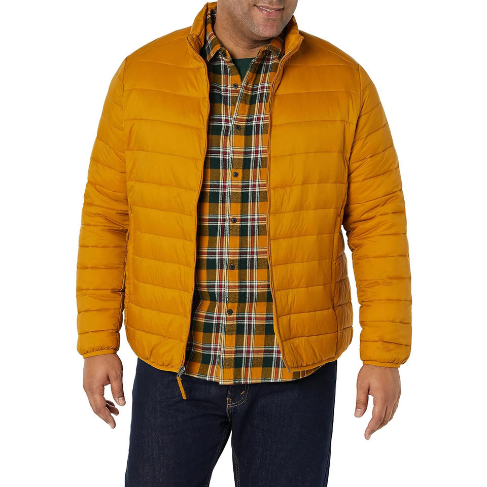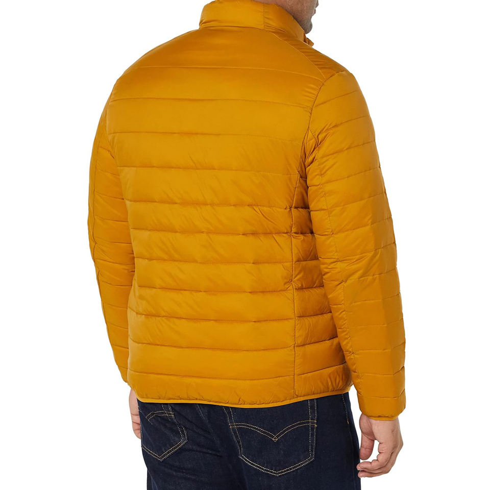 แจ็กเก็ตขนเป็ดหุ้มฉนวนกันความร้อนน้ำหนักเบาสำหรับผู้ชายมีซิปด้านหน้าและคอตั้งสีเหลืองมัสตาร์ดสำหรับสภาพอากาศหนาวเย็น