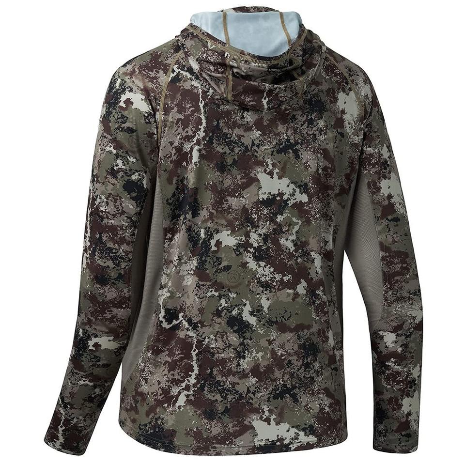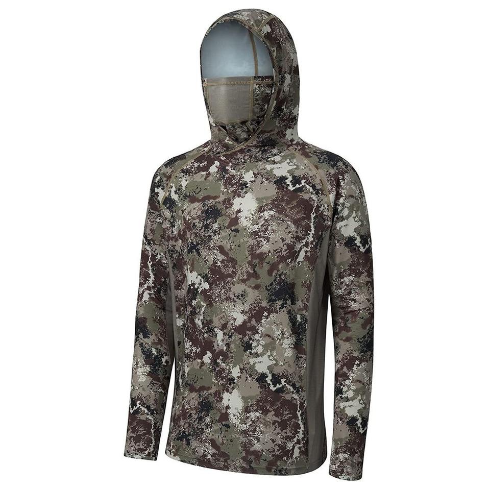 ชุดเสื้อตกปลากันน้ำแห้งเร็วน้ำหนักเบาของผู้ชายชุดเสื้อตกปลาระบายอากาศได้ดี UPF 50 + ป้องกันแสงแดดมีฮู้ดพิมพ์ลายกลางแจ้ง UV/spf RTS