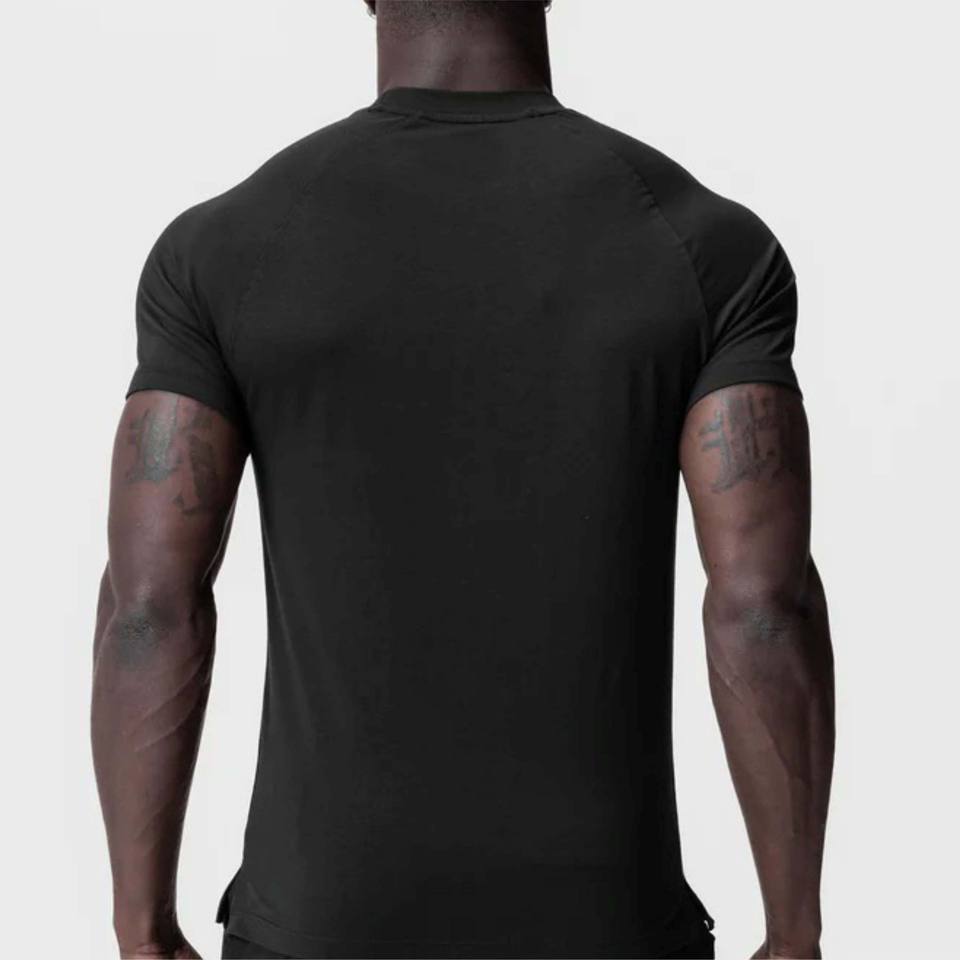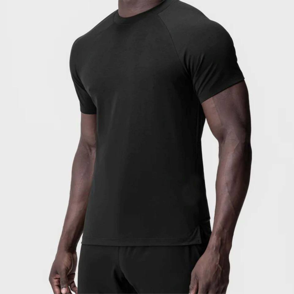 เสื้อยืดออกกำลังกายแบบแห้งเร็วสำหรับผู้ชายผ้าถักระบายอากาศคอกลมพิมพ์ลายพื้น
