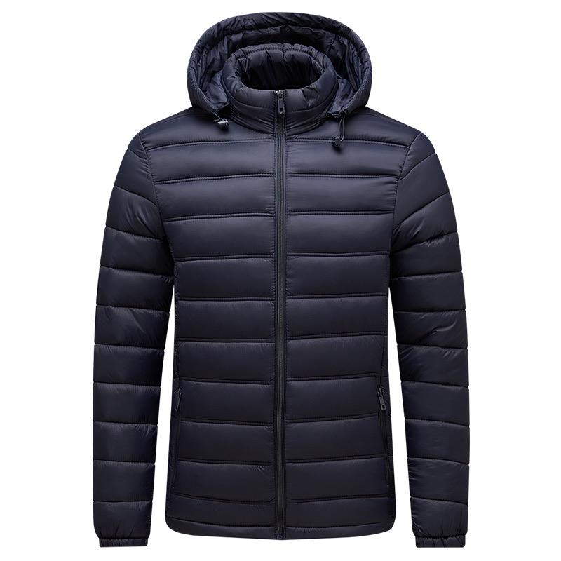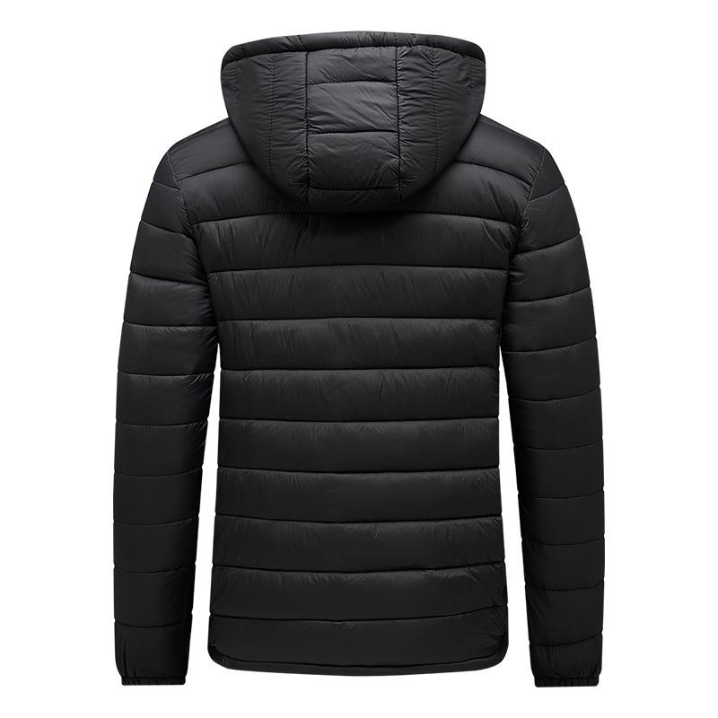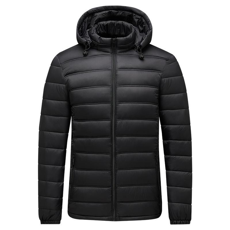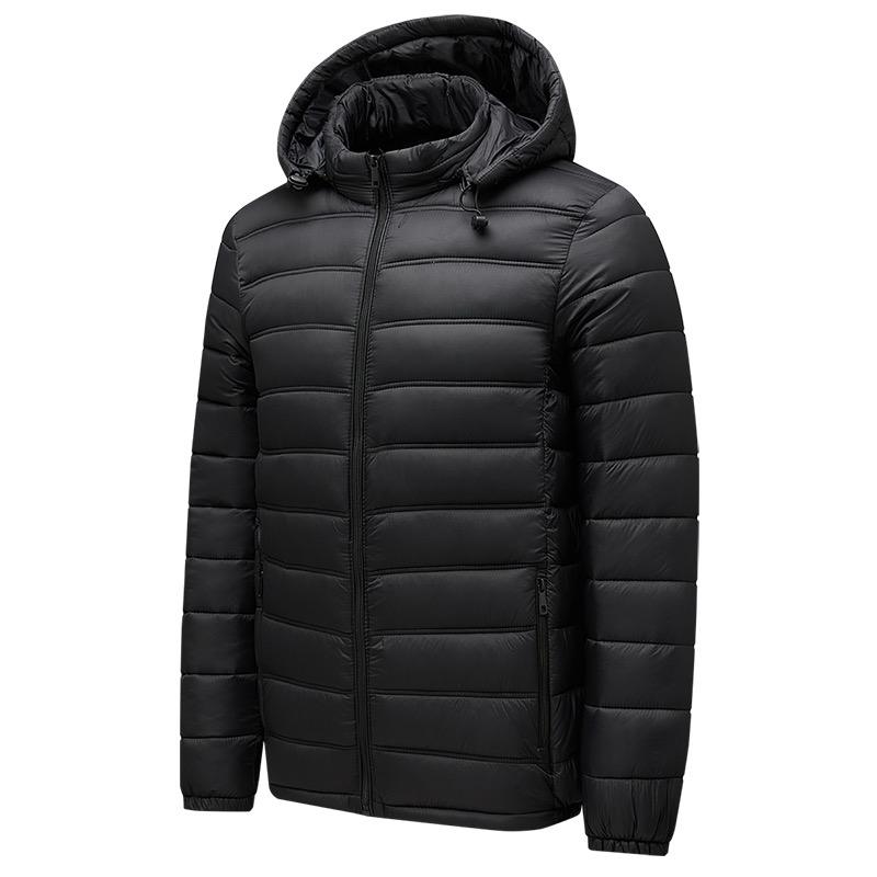 เสื้อแจ็คเก็ตพัฟเฟอร์น้ำหนักเบาสำหรับผู้ชาย สีดำ มีฮู้ด กันน้ำ อุ่น เหมาะสำหรับฤดูหนาว ใส่ได้ทั้งกิจกรรมกลางแจ้งและสวมใส่ลำลอง