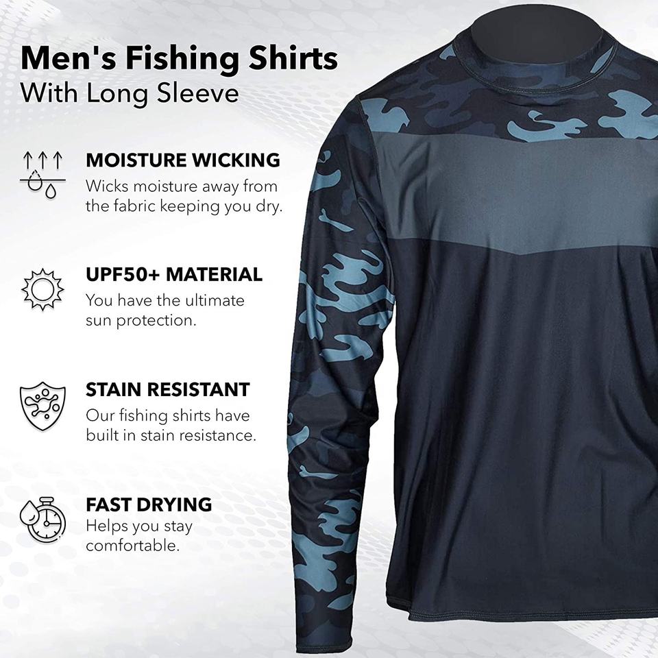 เสื้อตกปลาแขนยาว UPF 50 + ของผู้ชายเสื้อป้องกันแสงแดดพร้อมตาข่ายกันรอยเปื้อนและความชื้นชุดสวมใส่สำหรับตกปลา