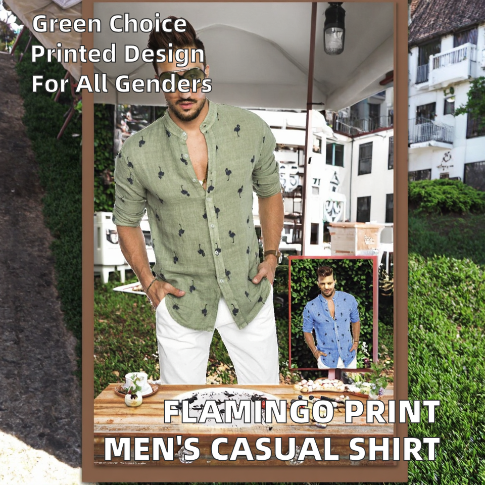 Men's Long Sleeve Stand Collar Flamingo Printed Eco-Friendly Casual Shirt Hot Style Plus Size Streetwear Knitted Weaving Method