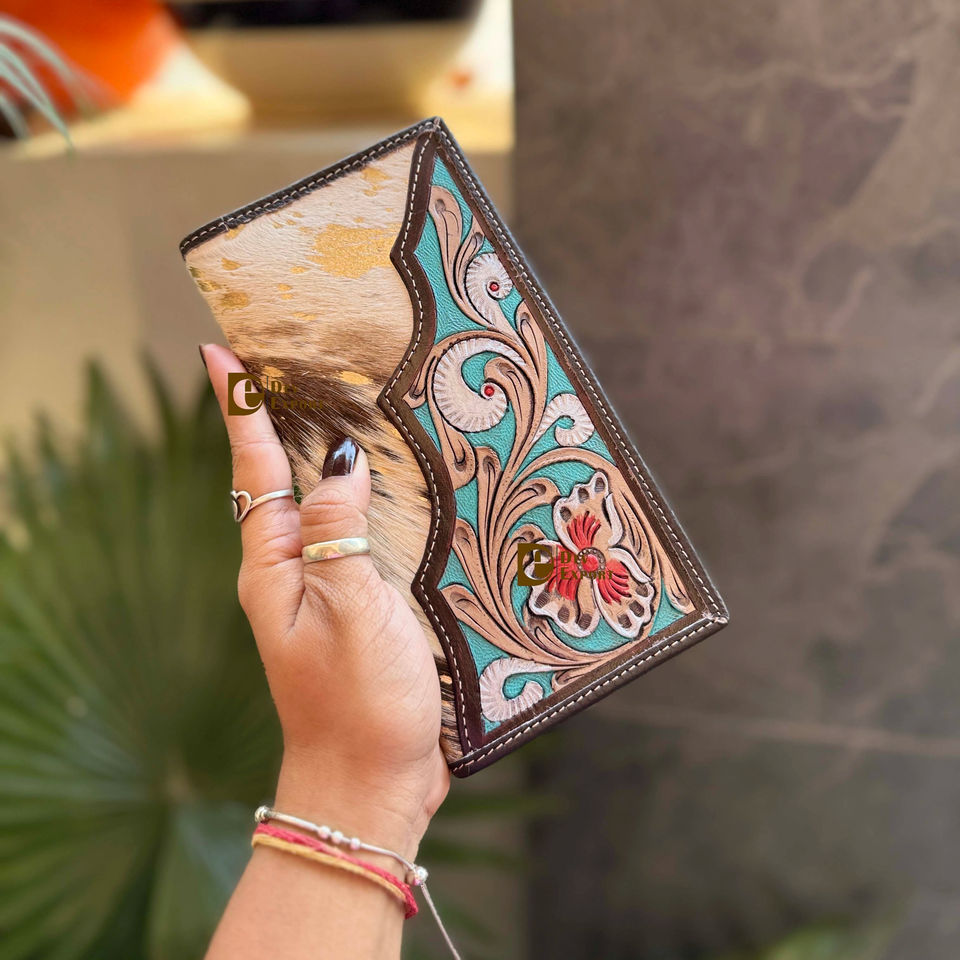 กระเป๋าสตางค์ยาวสำหรับผู้ชายหนังสไตล์ตะวันตกงานแกะสลักด้วยมือของขวัญเงินสดสีเทอร์ควอยซ์ทันสมัย