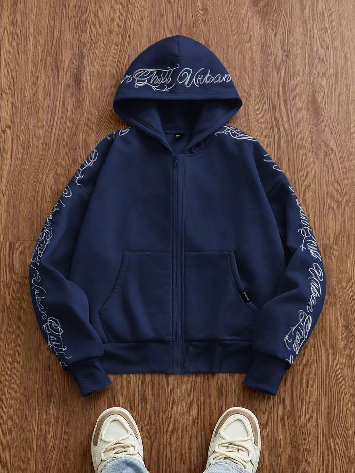 เสื้อฮู้ดแบบลำลองถักทรงหลวมสำหรับผู้ชายแขนยาวปักลายภาษาอังกฤษวินเทจปรับแต่งได้สำหรับฤดูหนาว