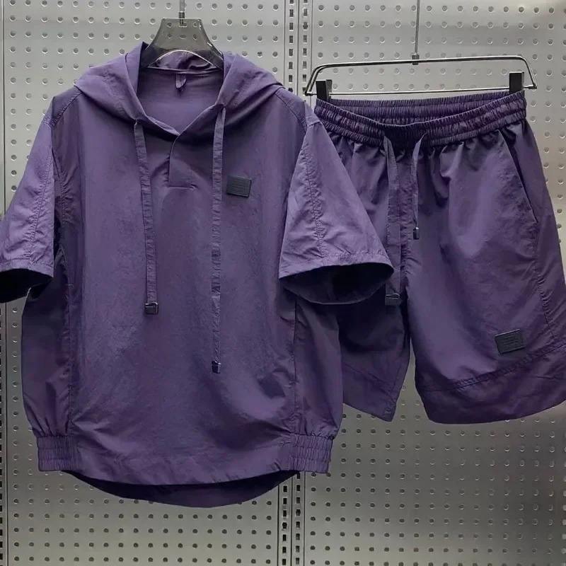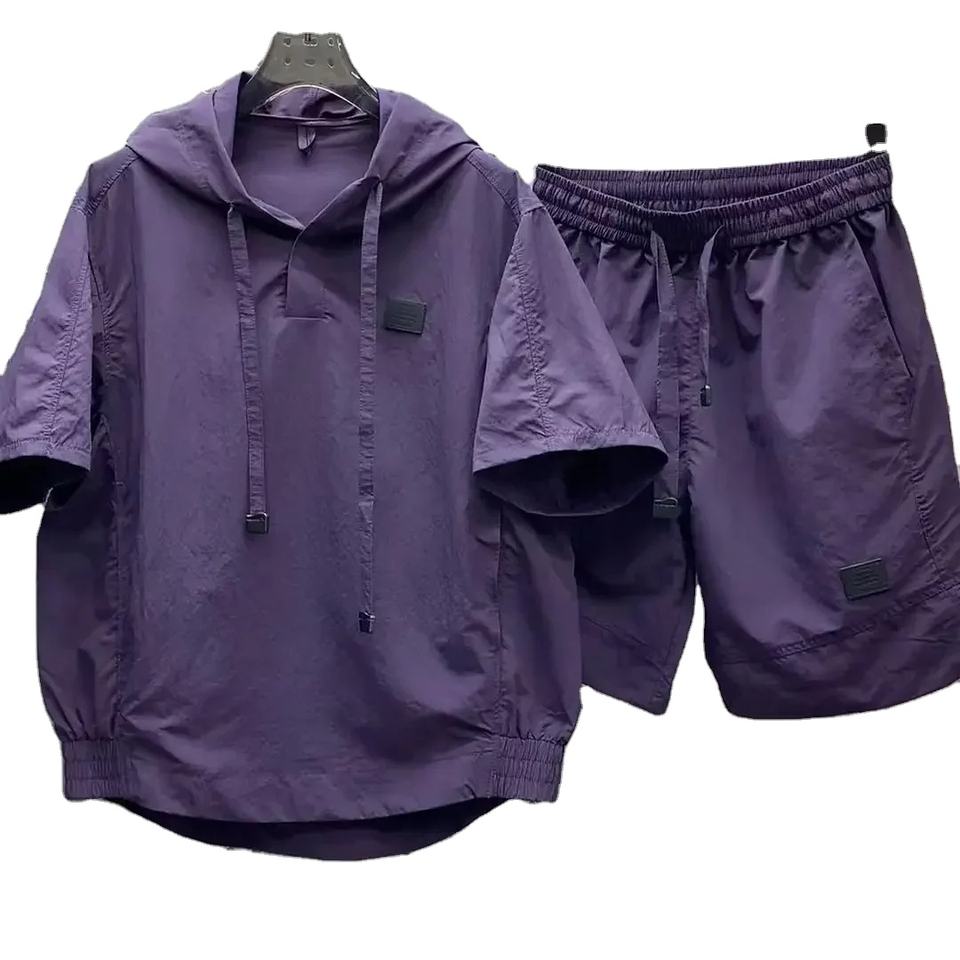 เสื้อยืดผู้ชายแบบหลวมระบายอากาศได้ดีชุดเสื้อผ้าแฟชั่นกระเป๋าทรงคาร์โก้แบบลำลองมีฮู้ดกางเกงขาสั้นแขนสั้นสองชิ้น