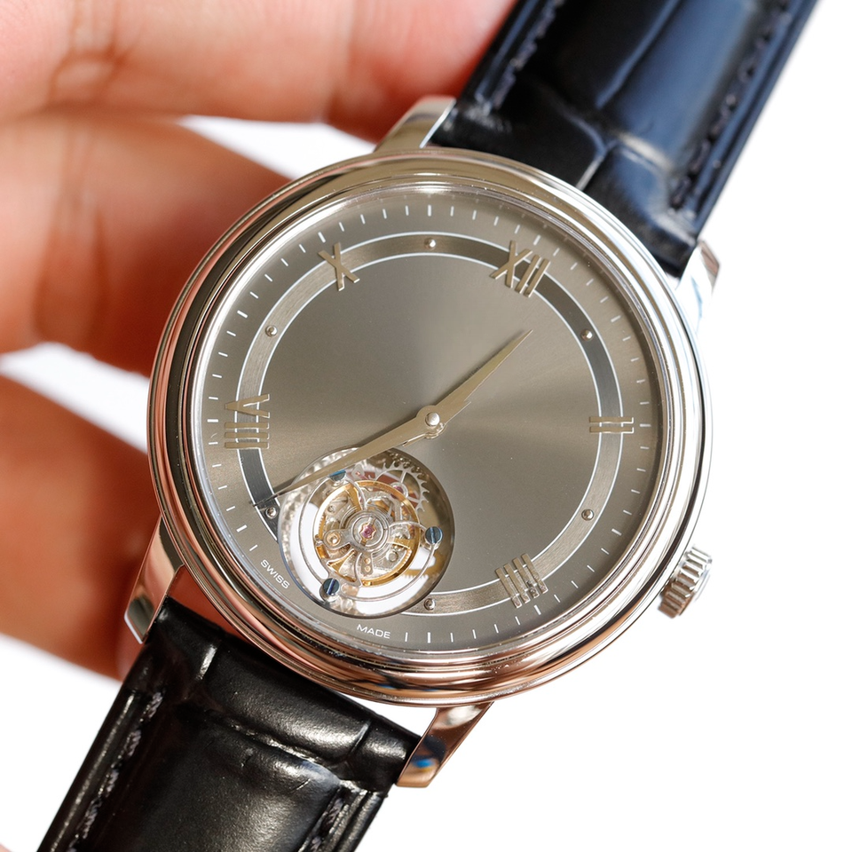 นาฬิกา Tourbillon หน้าปัดสีเทาหรูหราสำหรับผู้ชายสายหนังสีดำตัวเลขโรมันนาฬิกาข้อมือแบบกลไกทำจากสวิส