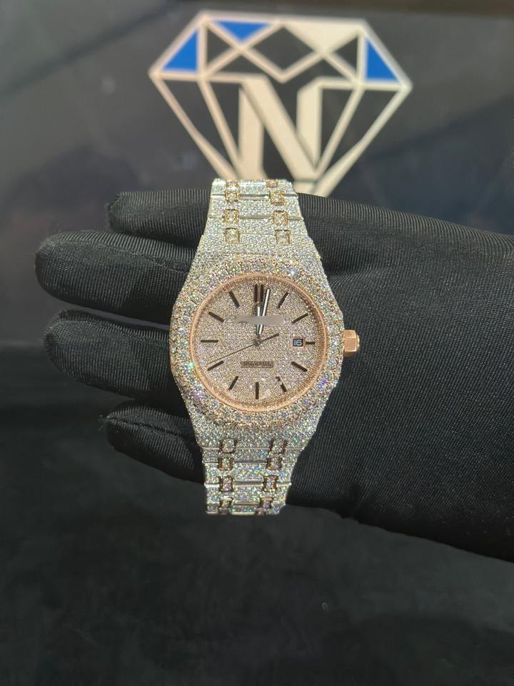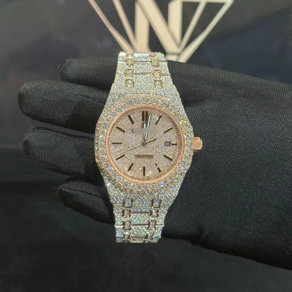 นาฬิกาข้อมือผู้ชายสุดหรูสไตล์ฮิปฮอป ตัวเรือนสแตนเลสประดับเพชรโมอิสซาไนต์ หน้าปัดทรงกลม กันน้ำได้ 10 บาร์ พร้อมตัวล็อคสายแบบกำไล