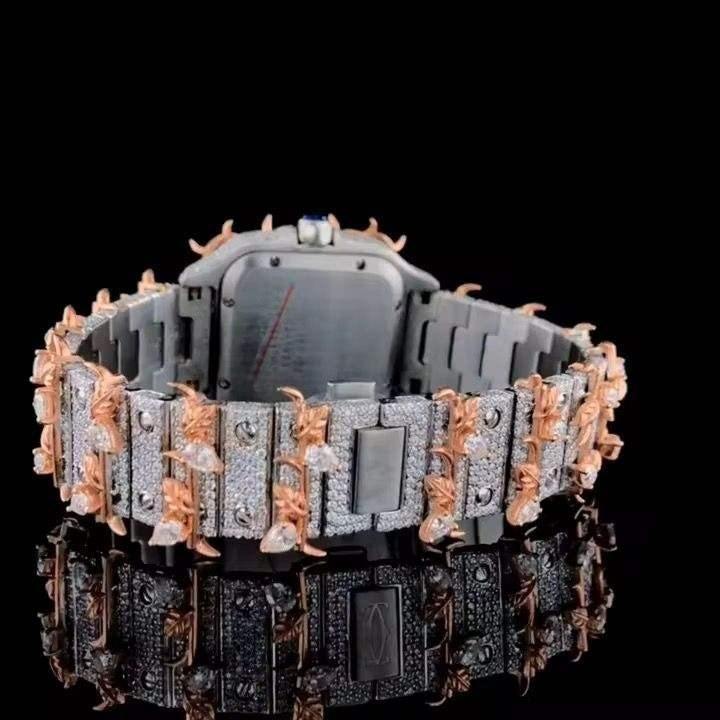นาฬิกาข้อมือผู้ชายสุดหรู สแตนเลสสตีล หน้าปัดสีแดง ประดับเพชรโมอิสซาไนต์เต็มหน้าปัด ระบบควอตซ์
