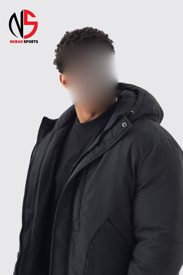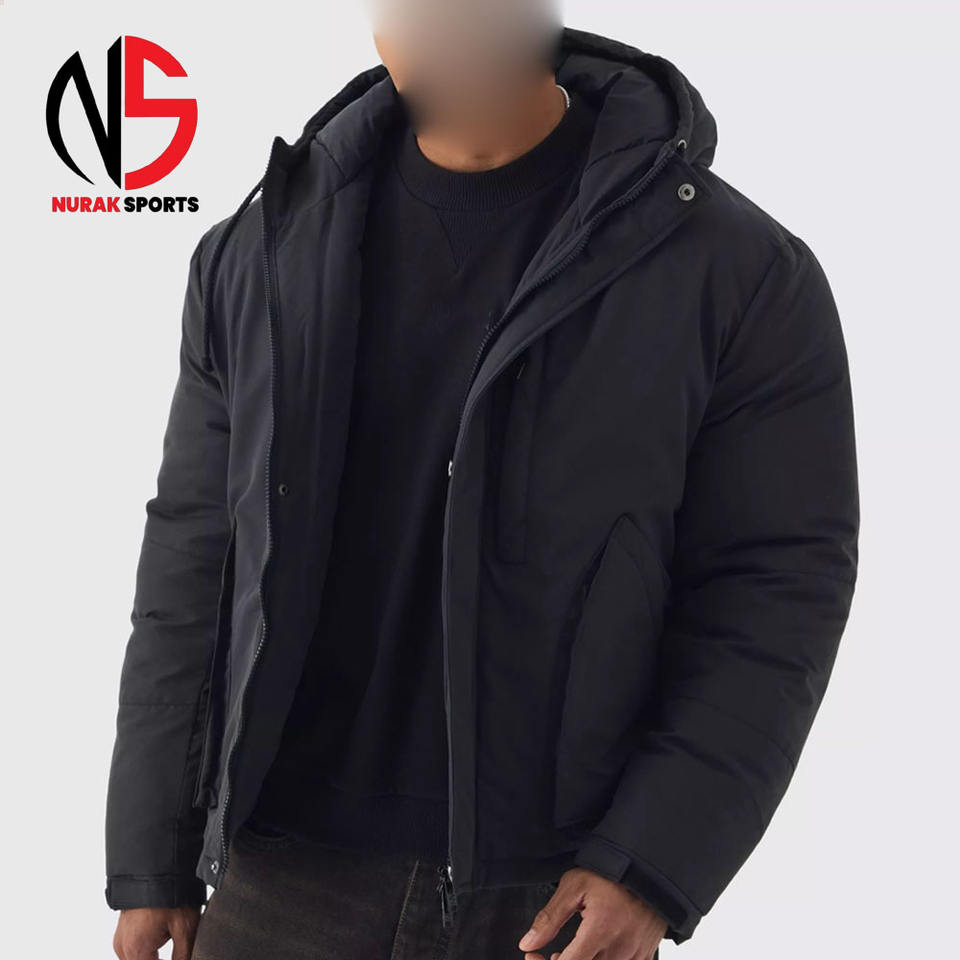 เสื้อแจ็คเก็ตพัฟเฟอร์ผู้ชายสีดำด้าน สไตล์มินิมอล สำหรับฤดูหนาว มีฮู้ดบุขน กันลม อุ่นสบาย เหมาะสำหรับสภาพอากาศหนาวเย็น ทำจากผ้าแคนวาส รุ่นปี 2026