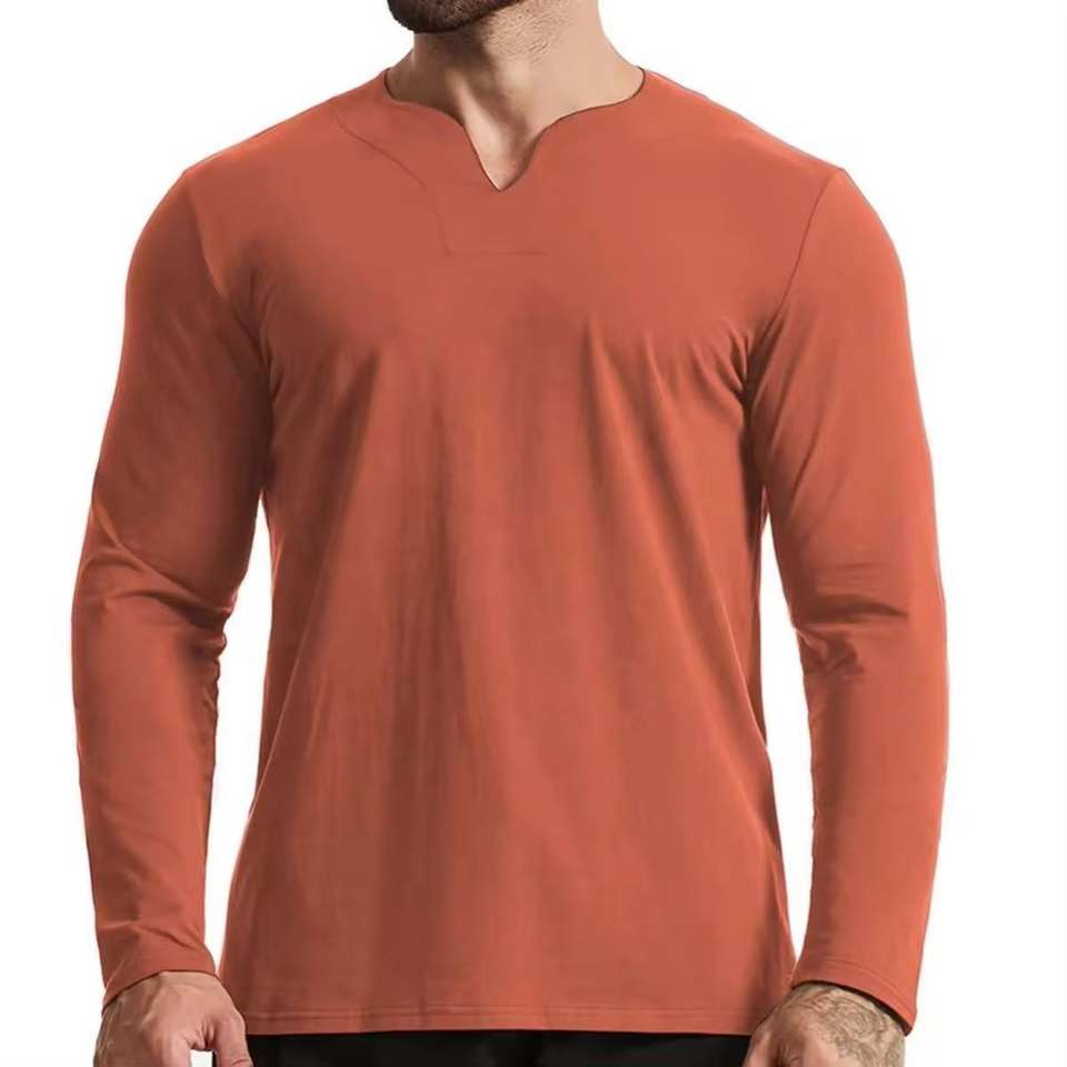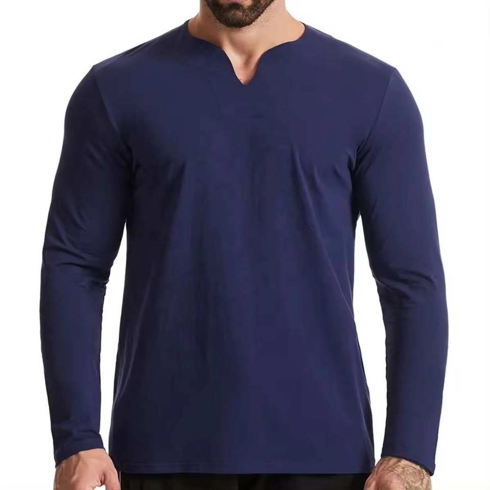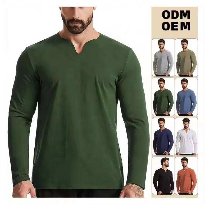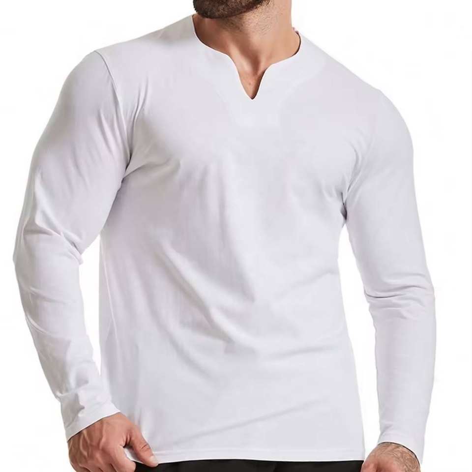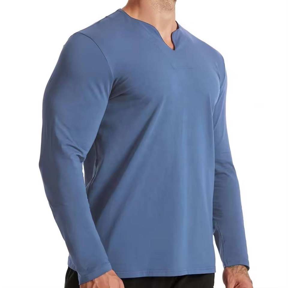 เสื้อกีฬาคอวีเข้ารูปสำหรับผู้ชายเสื้อยืดฟิตเนสแขนยาวผ้าฝ้าย