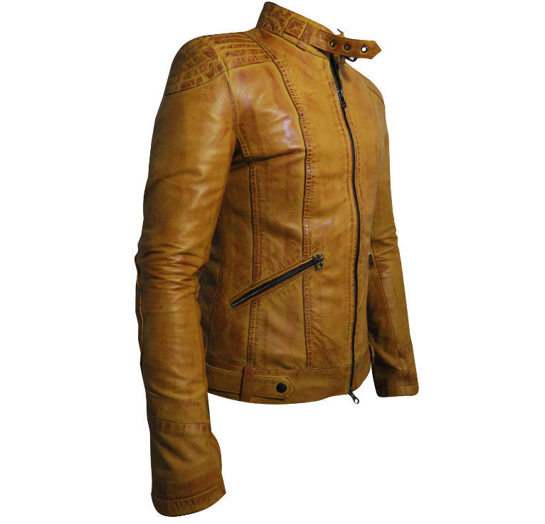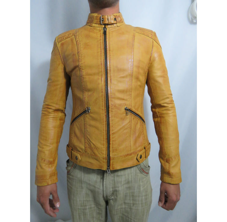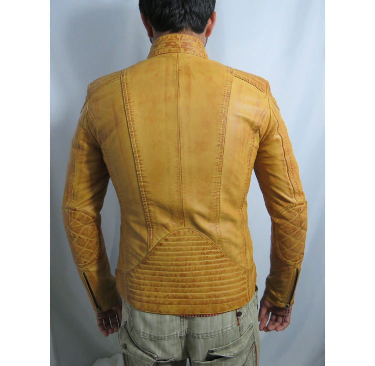 เสื้อแจ็คเก็ตมอเตอร์ไซค์หนังแท้สีเหลืองมัสตาร์ดสำหรับผู้ชาย กันน้ำ กันลม ทรงเข้ารูป สไตล์ไฮสตรีท
