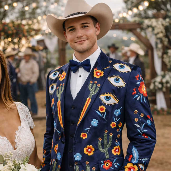 ชุดสูทเบลเซอร์ปักลายสีน้ำเงินกรมท่าสำหรับผู้ชาย – ลายดอกไม้ กระบองเพชร และลายตาปีศาจ สำหรับงานแต่งงานและงานปาร์ตี้