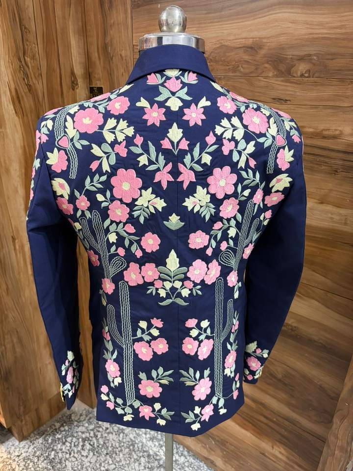 ชุดสูทปักลายสไตล์ตะวันตกสีน้ำเงินกรมท่าสำหรับผู้ชาย – เสื้อเบลเซอร์ลายดอกไม้และกระบองเพชรพร้อมกางเกงเข้าชุด