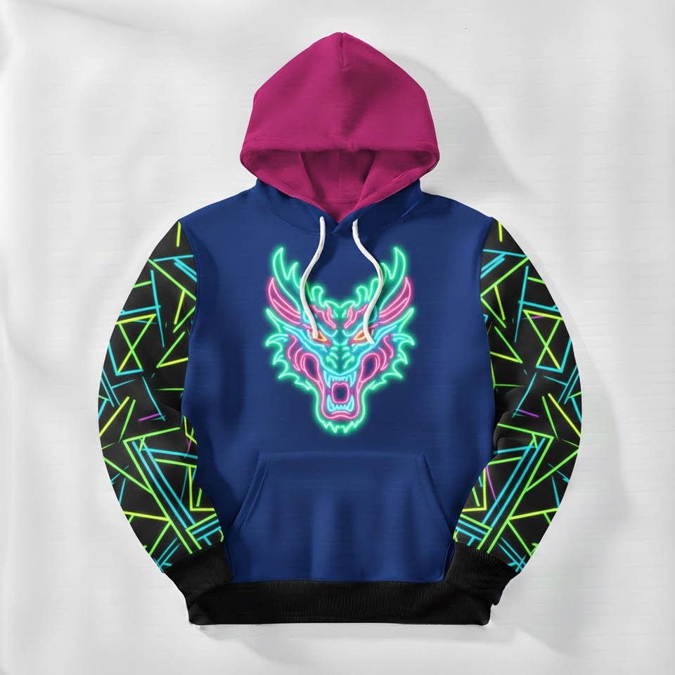 เสื้อฮู้ดดี้ผู้ชายลายกราฟิกเรขาคณิตนีออน พิมพ์ลายแผงวงจรดิจิทัลที่แขนเสื้อ ความละเอียดสูง สไตล์สตรีทแวร์ ฮู้ดตัดสี