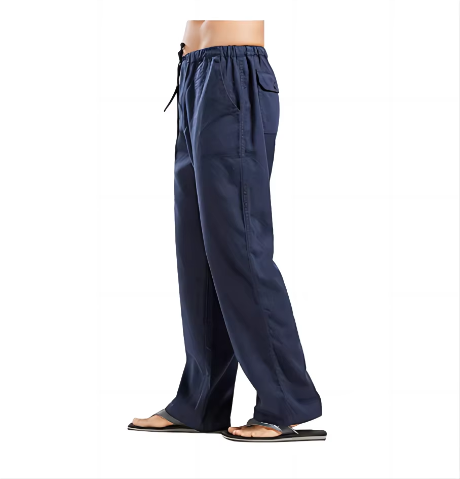 กางเกงสเวตเตอร์ผ้าลินินทรงหลวมน้ำหนักเบาสำหรับผู้ชายกางเกงวิ่งลำลองขากว้างสำหรับใส่ทำงานและเดินรัดรูป