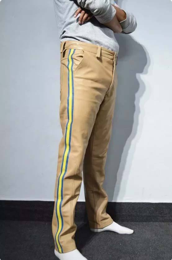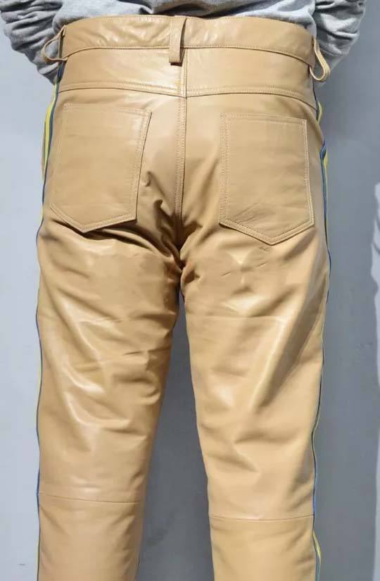กางเกงนักขี่จักรยานหนังลายทางสำหรับผู้ชายกางเกงหนังแกะดีไซน์ใหม่