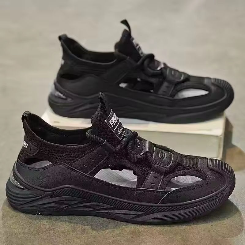 รองเท้าแตะหนังคุณภาพสูงสำหรับผู้ชายรุ่นใหม่สำหรับฤดูใบไม้ร่วง ระบายอากาศได้ดี ปิดนิ้วเท้า เหมาะสำหรับใส่ไปชายหาด เพิ่มความสูง กันลื่น แบบมีรูระบายอากาศ