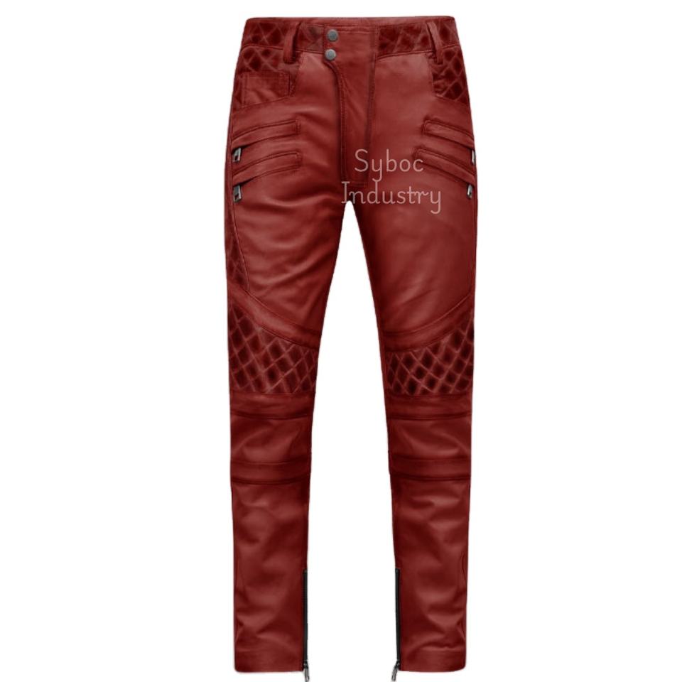 กางเกงหนังสีแดงเข้ารูปสำหรับผู้ชายกางเกงหนังแท้พร้อมกระเป๋าและซิป
