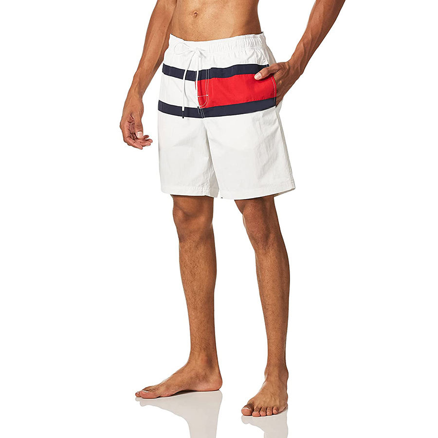 Men's Nylon White, Red, and Navy Blue Color Block Drawstring Waist Quick-Dry Swim Trunks - Modern Striped Design"