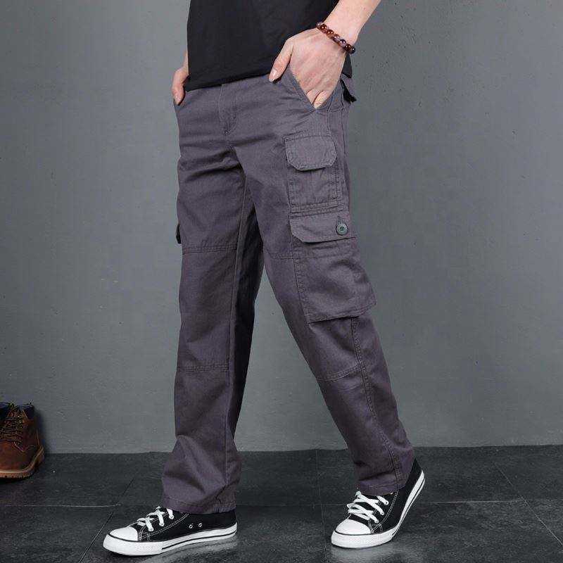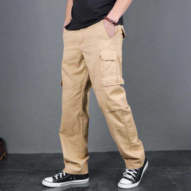 กางเกงคาร์โก้สีเขียวมะกอกสำหรับผู้ชาย ผ้าทวิลล์คอตตอน ทนทานและไม่ยับง่าย ดีไซน์อเนกประสงค์หลายกระเป๋า ทรงหลวมตรง