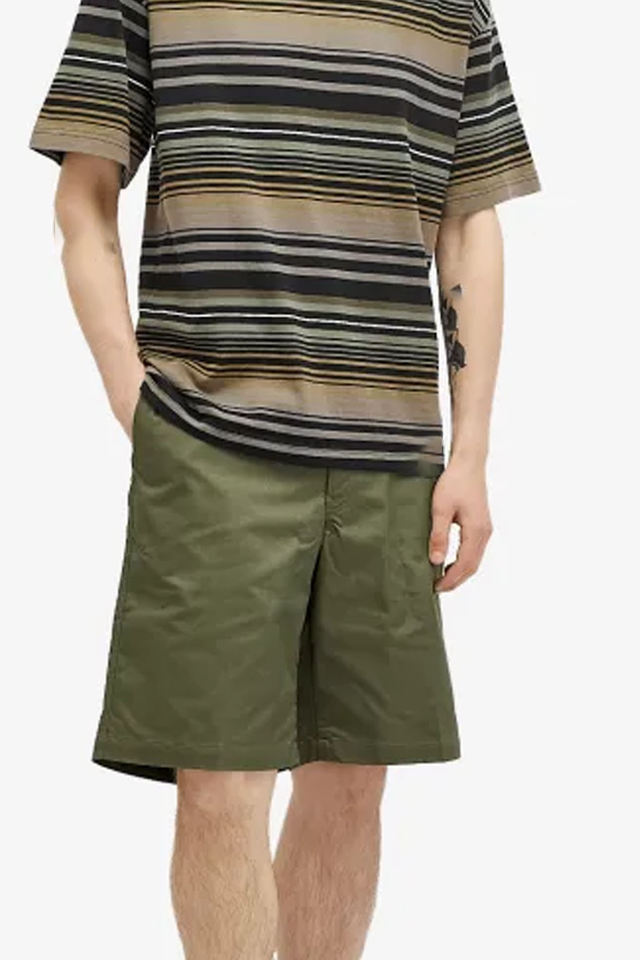 กางเกงขาสั้นผ้าทวิลสีเขียวมะกอกของผู้ชายดีไซน์หน้าเรียบสะอาดพร้อมสายรัดแบบผ่อนคลายและสไตล์สบายๆในทุกๆวัน