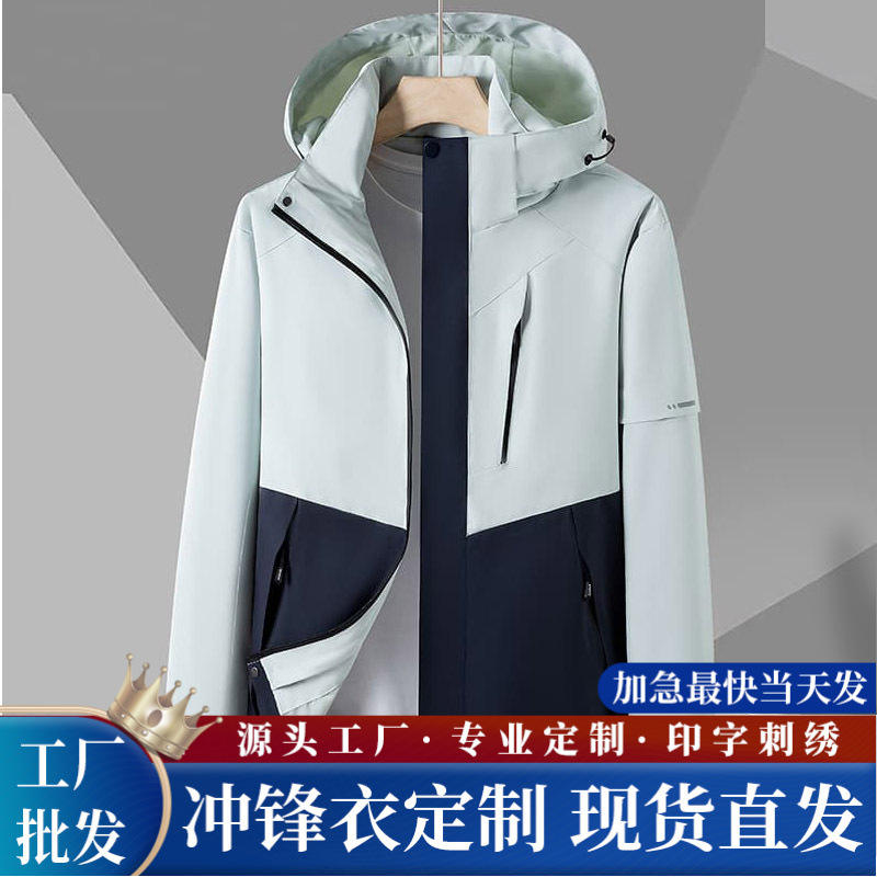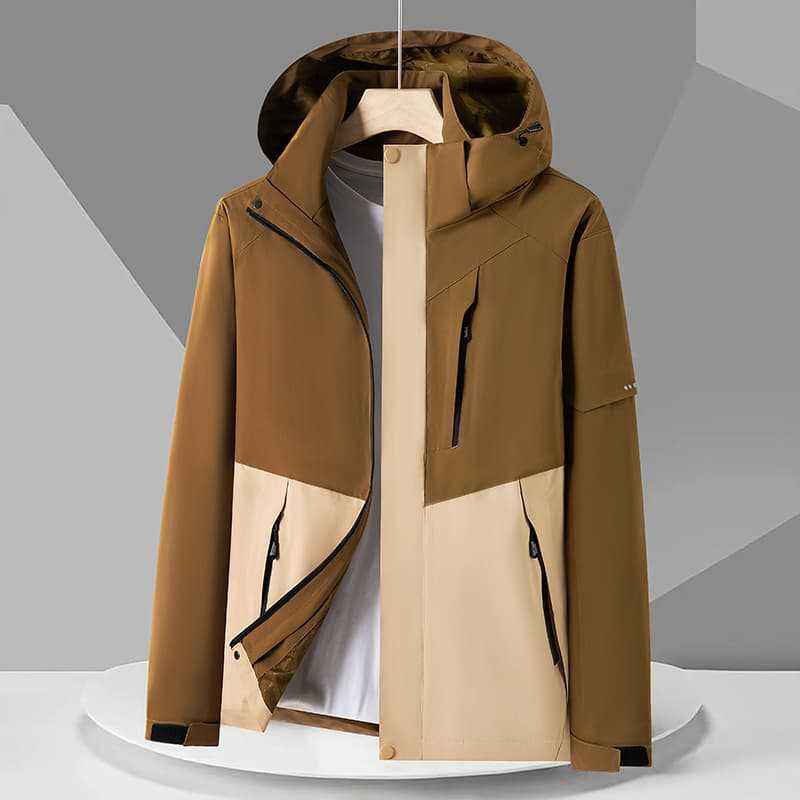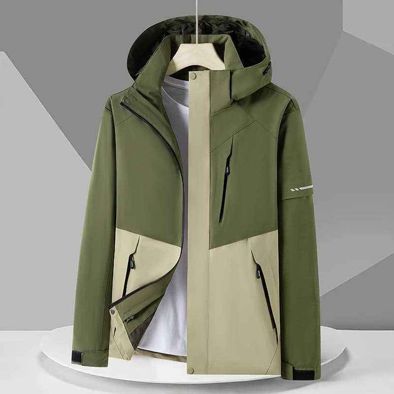 เสื้อแจ็คเก็ตกันลมมีฮู้ดสำหรับผู้ชายสำหรับกิจกรรมกลางแจ้ง พร้อมซับใน ชุดทำงานฤดูหนาว สีพื้น ดีไซน์ตัดกัน