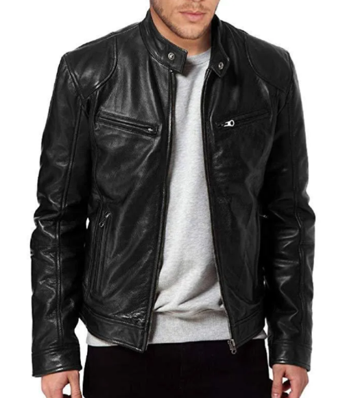 แจ็กเก็ตหนังสีดำสำหรับผู้ชายสำหรับใส่กลางแจ้งเสื้อแจ็กเก็ตขี่มอเตอร์ไซด์สีดำสำหรับผู้ชายดีไซน์คอตามสั่งสไตล์ใหม่