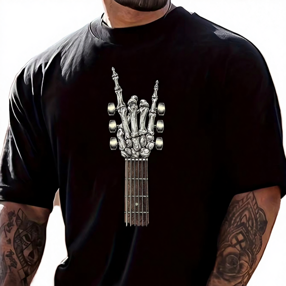 Men's Oversized Short Sleeve O-Neck Silk Screen Printed Guitar Neck Rock Roll Skeleton T-Shirt Custom Logo Cotton Bamboo Fiber