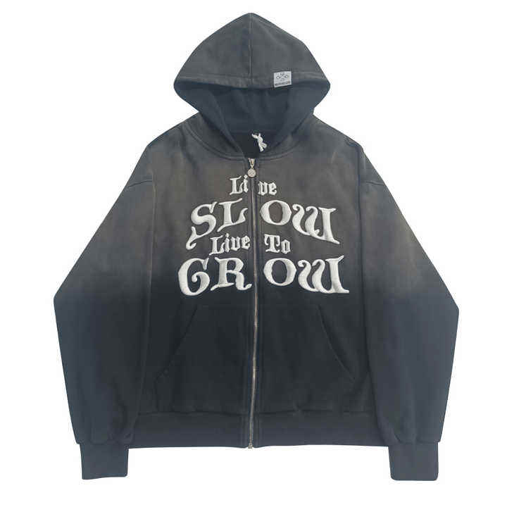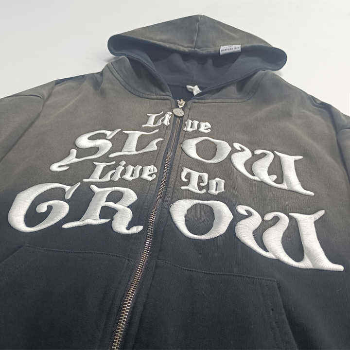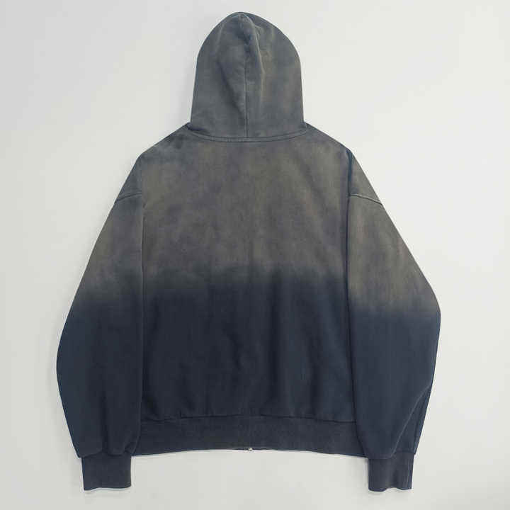 เสื้อฮู้ดดี้ผู้ชายสไตล์วินเทจทรงบ็อกซี่แบบซิป ผ้าฝ้ายฟลีซ 100% หนัก 500gsm ขอบเสื้อครอปแบบทำสีซีดด้วยเทคนิค Acid Washing พิมพ์ลายดิจิตอล DTG สำหรับฤดูใบไม้ร่วง