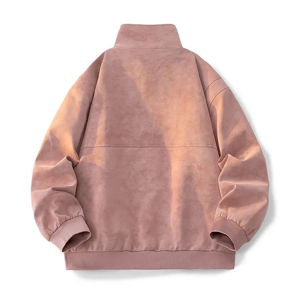 เสื้อแจ็กเก็ตหนัง PU สีชมพูอ่อนสำหรับผู้ชายคอตั้งมีซิปด้านหน้าปิดกันลมลำลองเครื่องแต่งกายแนวสตรีทสำหรับขี่มอเตอร์ไซค์