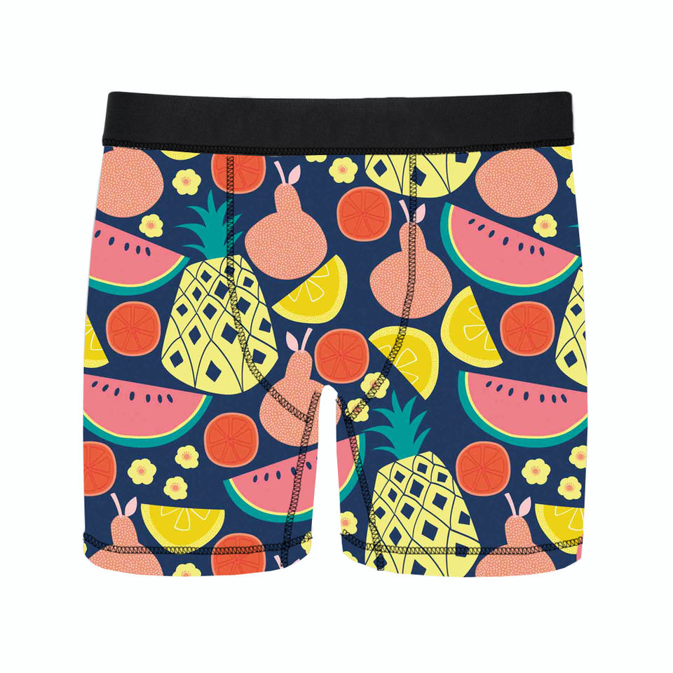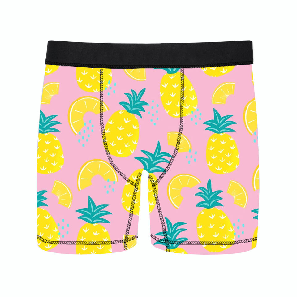 กางเกงในบ็อกเซอร์พิมพ์ลายสับปะรดสำหรับผู้ชายกางเกงขาสั้นผ้าโพลีเอสเตอร์ถักระบายอากาศปรับแต่งได้
