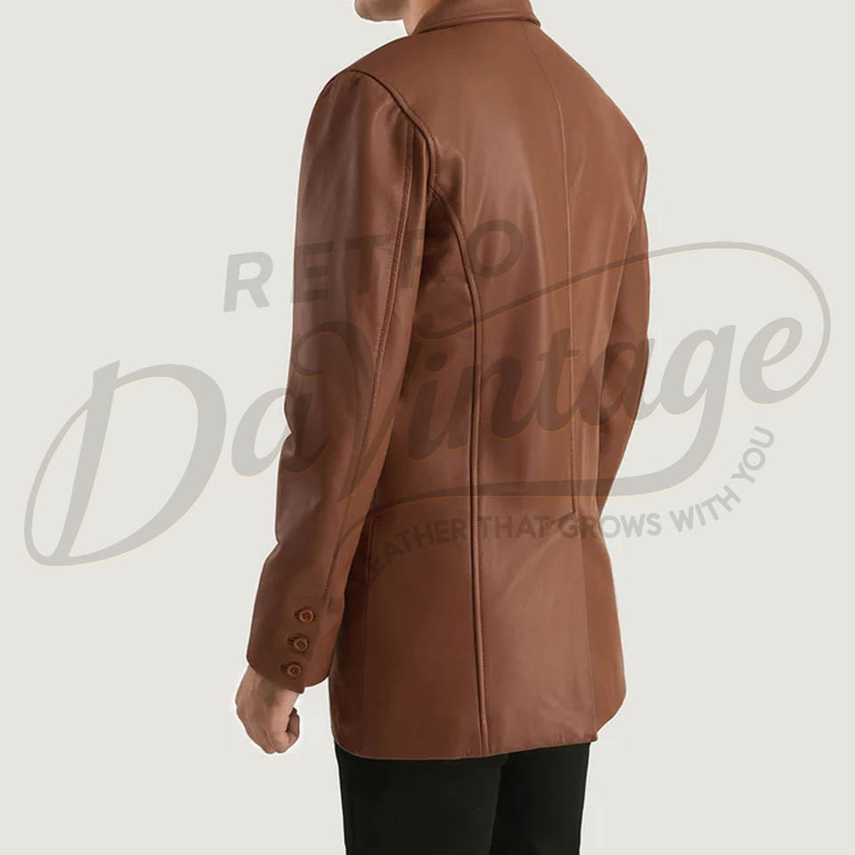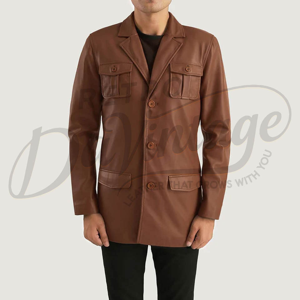 เสื้อเบลเซอร์หนังแกะแท้สีน้ำตาลพรีเมียมสำหรับผู้ชาย สไตล์ซาฟารี วินเทจ 4 กระเป๋า เสื้อโค้ทหนังแกะแท้ลำลองสำหรับงานธุรกิจและงานปาร์ตี้